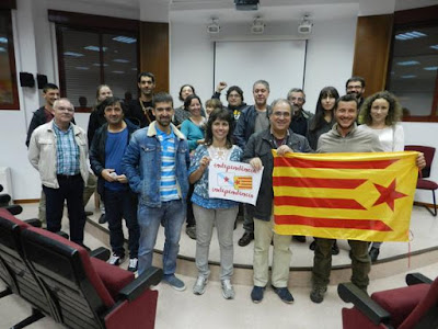 | Algúns dos asistentes, ao final do acto, coa bandeira catalá. |